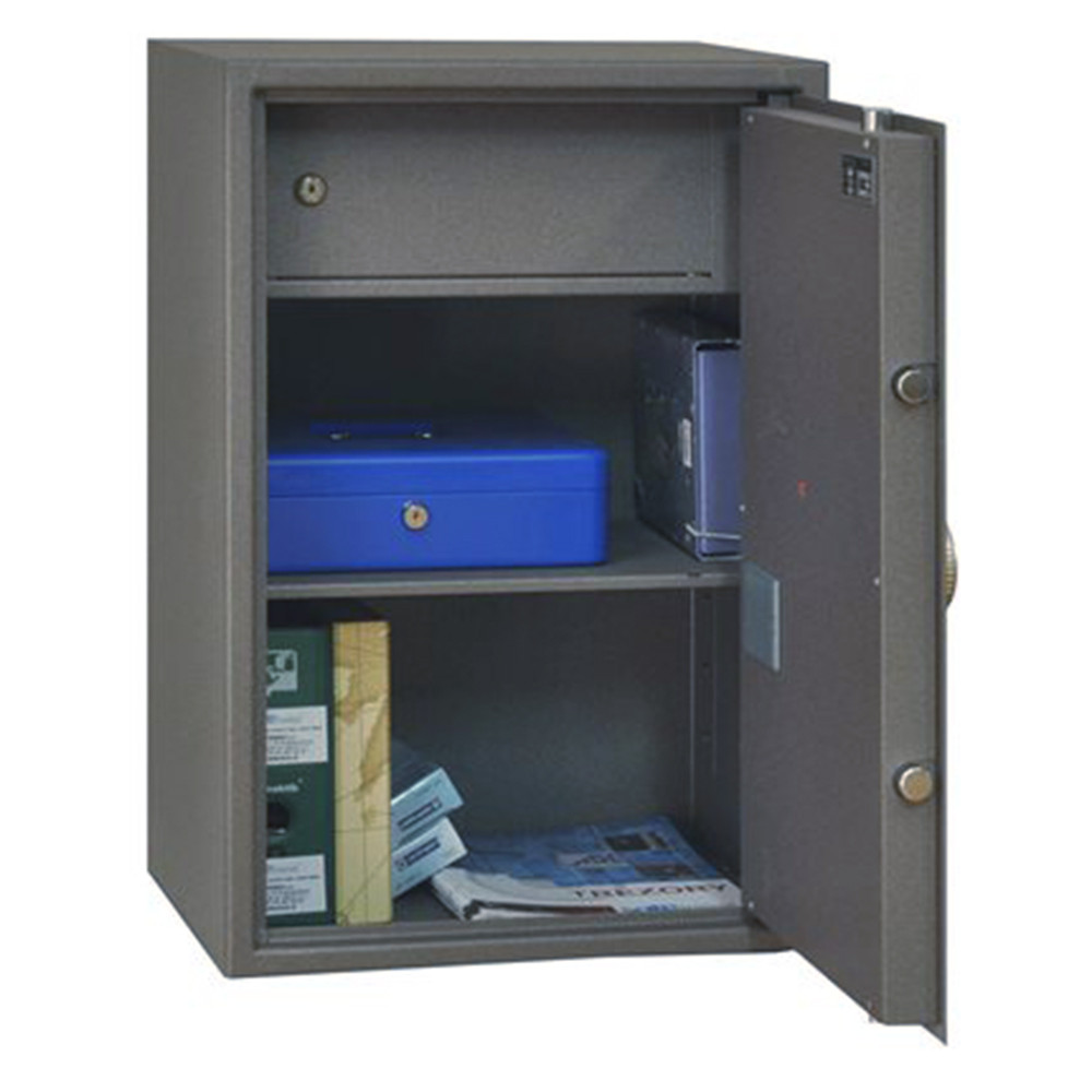 • minőségi trezor dokumentumoknak, értéktárgyaknak• 2,5 mm-es egyfalú trezor test, erős acéllemezből• 40 mm vastag duplafalú ajtó, 3 mm-es acél borítással• 90 fokos ajtónyitás erős jobboldali zsanérokkal• egyirányú (ZSL 17, 28, 43) vagy háromirányú (ZSL 65, 100, 120) zárás 22 mm-es forgó acél hevederekkel• mangán acéllappal védett zárszerkezet (fúrás ellen)• elektronikus számkombinációs zár• süllyesztett fólia billentyűzet, belső elemtartó• 3-8 számjegy közötti felhasználói kód• mechanikus vésznyitás (duplatollú kulcsos zárral)• zár 4 db Mignon LR 6 AA 1,5V elemmel működik• kilincs 25 mm-t áll ki az ajtó síkjából• praktikus iratrendező mélység• kivehető, állítható magasságú polc• 65-ös mérettől zárható belső trezorral• 10 mm-es rögzítő furatok lefelé és hátrafelé• gránit színben, 2 db vésznyitó kulccsal szállítjuk
