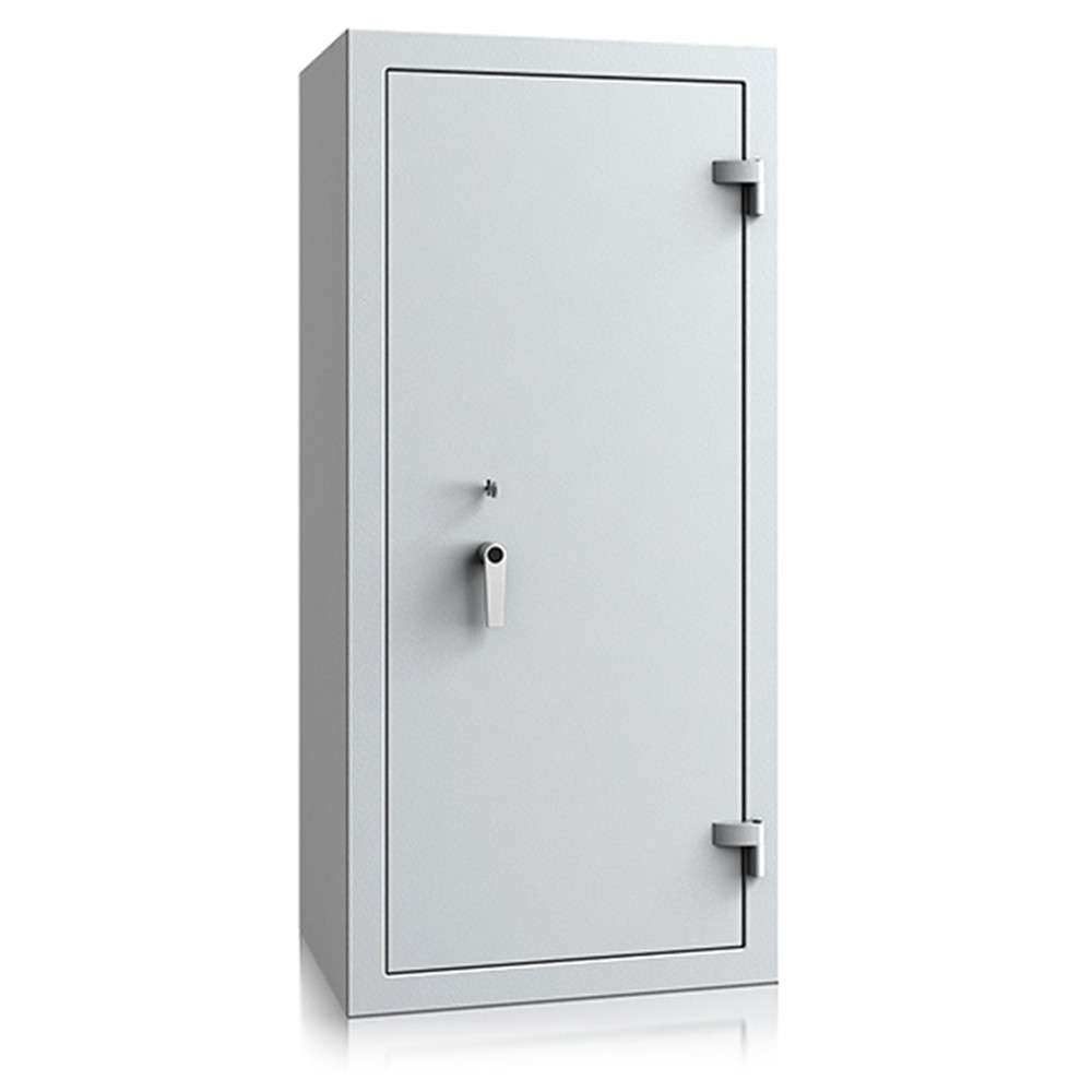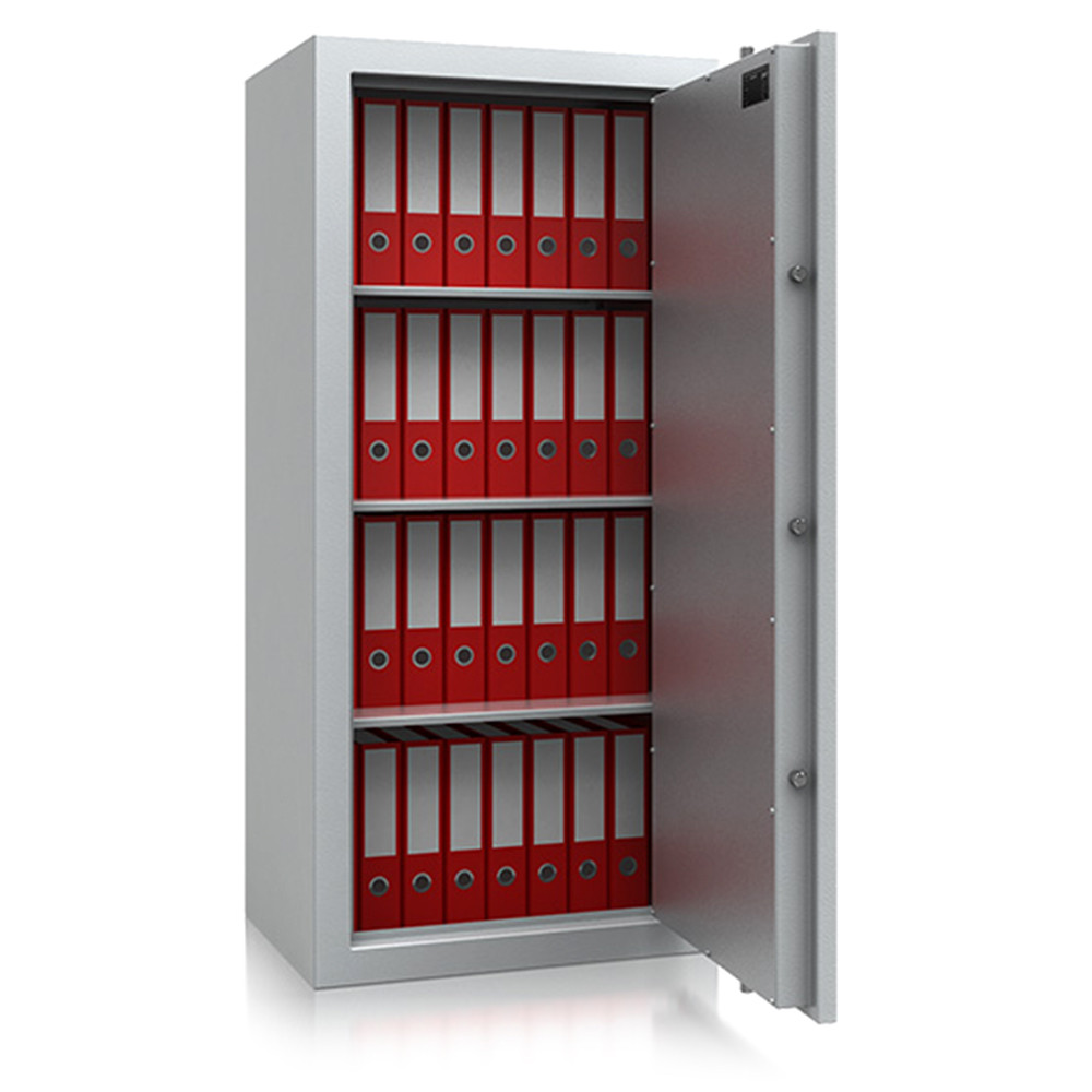 • 30 mm vastag, duplafalú test 1,5 mm-es acélból• 81 mm vastag, duplafalú ajtó 3 mm-es acél borítással• 180 fokos ajtónyitás a külső zsanéroknak köszönhetően• háromirányú zárás, 25 mm-es kerek, acél hevederekkel• erős acél rögzítő rudak a zsanéroldalon• felfúrás ellen mangán acéllappal védett zárszerkezet• tűzálló szigetelés a testben és az ajtóban• Potsdam 5 és 6 duplaszárnyú ajtóval készül• állítható magasságú polcok• rögzítő furatok nélkül• világosszürke (RAL 7035) szín