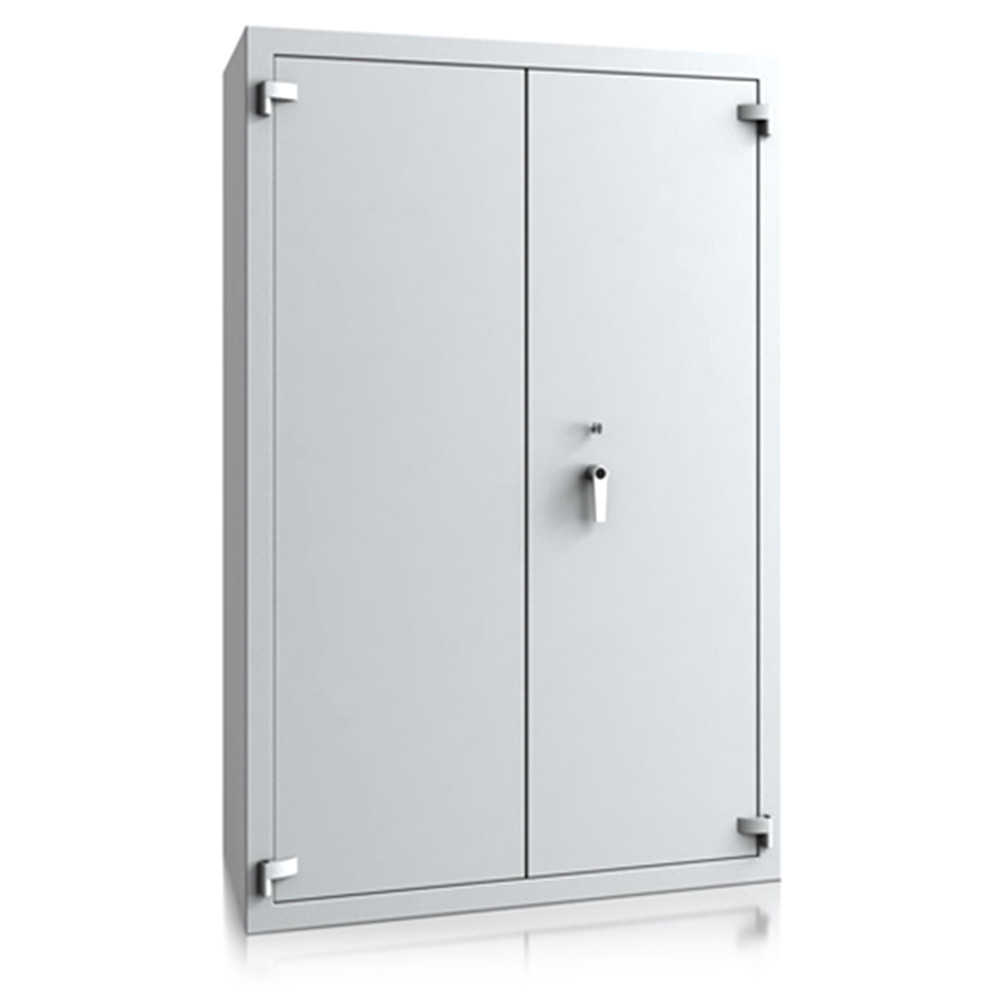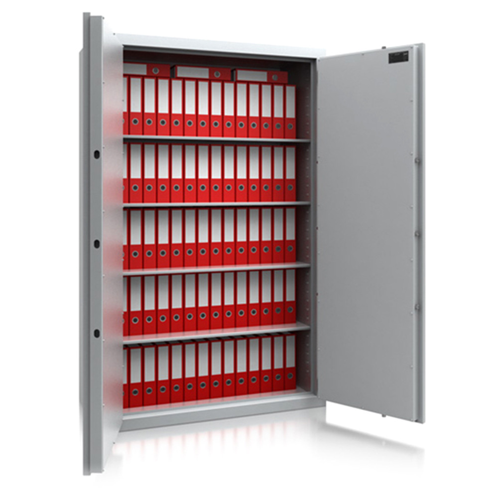 • 30 mm vastag, duplafalú test 1,5 mm-es acélból• 81 mm vastag, duplafalú ajtó 3 mm-es acél borítással• 180 fokos ajtónyitás a külső zsanéroknak köszönhetően• háromirányú zárás, 25 mm-es kerek, acél hevederekkel• erős acél rögzítő rudak a zsanéroldalon• felfúrás ellen mangán acéllappal védett zárszerkezet• tűzálló szigetelés a testben és az ajtóban• Potsdam 5 és 6 duplaszárnyú ajtóval készül• állítható magasságú polcok• rögzítő furatok nélkül• világosszürke (RAL 7035) szín