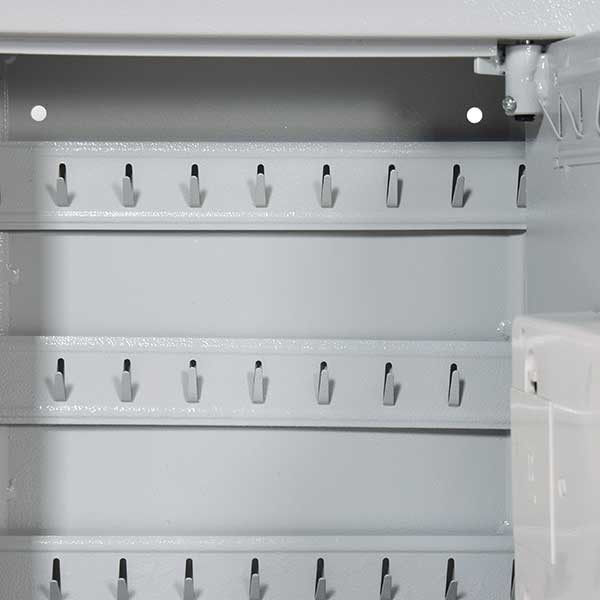 • elektronikus kulcsszekrény besurranó tolvajok ellen• kivehető, állítható magasságú kulcsakasztókkal• 2 mm-es acél test és 4 mm-es acél ajtó• 90 fokos ajtónyitás jobboldali zsanérokkal• egyirányú zárás 16 mm-es acél hevederekkel• elektronikus számkombinációs zár• 3-8 számjegy közötti felhasználói kód• 3 téves kódbevitel után 20 másodperces büntetőidő• mechanikus vésznyitási lehetőség körkulccsal• zár 4 db Mignon LR 6 AA 1,5V elemmel működik• rögzítő furatok hátrafelé• szürke színben, rögzítő csavarokkal, elemekkel áruljuk