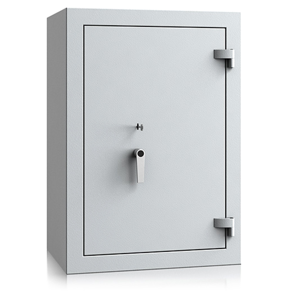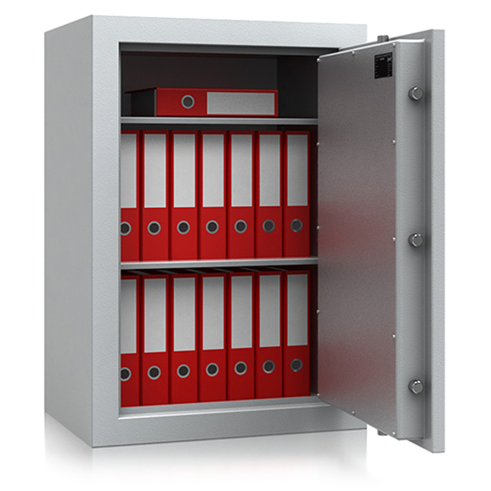 • 60 mm vastag duplafalú kompakt acél test• 100 mm vastag, háromfalú ajtó, erős acél borítással• 180 fokos ajtónyitás a külső zsanéroknak köszönhetően• háromirányú zárás, 25 mm-es kerek, acél hevederekkel• erős acél rögzítő rudak a zsanéroldalon• felfúrás ellen mangán acéllappal védett zárszerkezet• tűzálló szigetelés a testben és az ajtóban• Düsseldorf 6 és 7 duplaszárnyú ajtóval készül• állítható magasságú polcok• rögzítő furatok nélkül• világosszürke (RAL 7035) szín