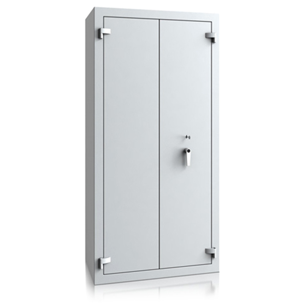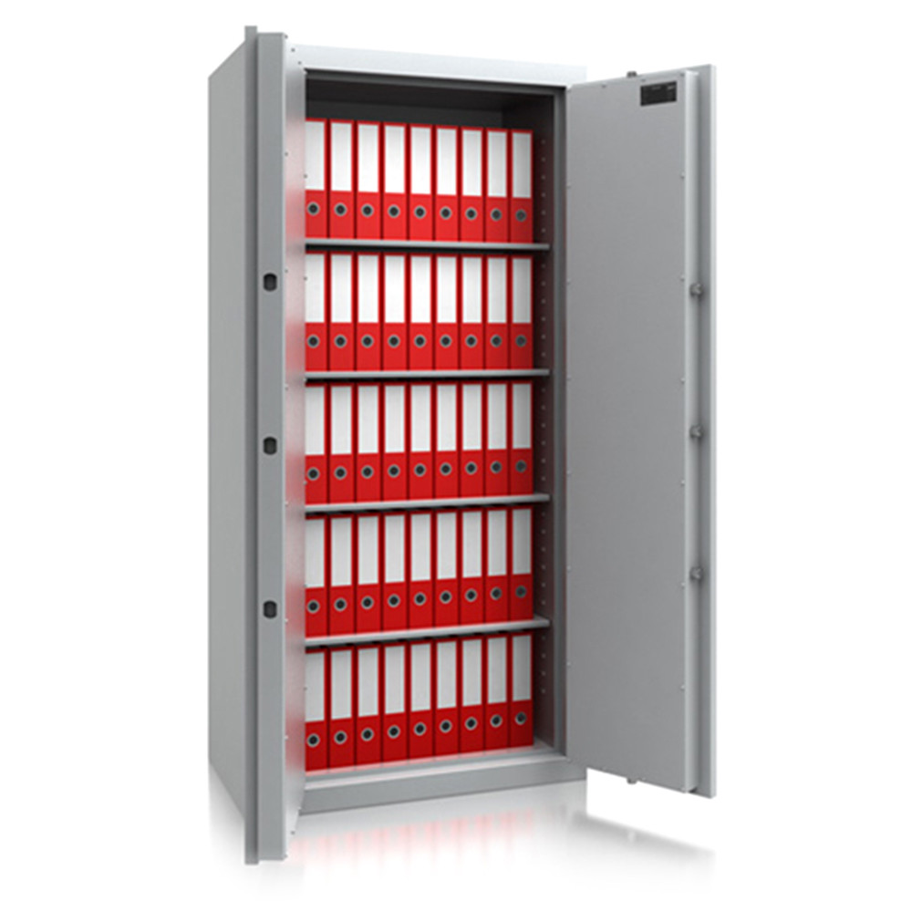 • 60 mm vastag duplafalú kompakt acél test• 100 mm vastag, háromfalú ajtó, erős acél borítással• 180 fokos ajtónyitás a külső zsanéroknak köszönhetően• háromirányú zárás, 25 mm-es kerek, acél hevederekkel• erős acél rögzítő rudak a zsanéroldalon• felfúrás ellen mangán acéllappal védett zárszerkezet• tűzálló szigetelés a testben és az ajtóban• Düsseldorf 6 és 7 duplaszárnyú ajtóval készül• állítható magasságú polcok• rögzítő furatok nélkül• világosszürke (RAL 7035) szín