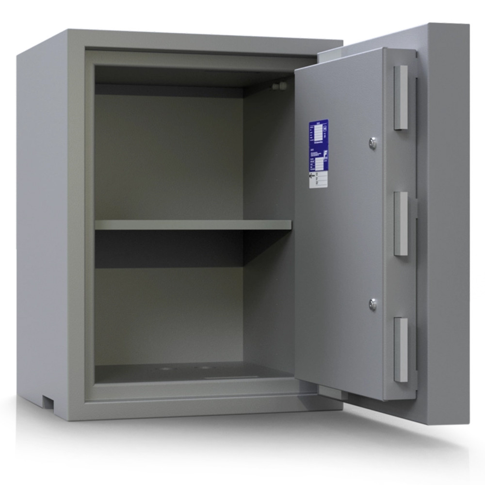 • 80mm vastag acél test, speciálisan megerősített beton töltettel (maximális védelem lángvágás és flexelés ellen)• 160mm vastag acél ajtó (ebből 70mm extra erős beton)• 60mm-re kiemelkedő elegáns alumínium kilincs• 180 fokos ajtónyitás, erős külső zsanérokkal• rögzítő fülek a zsanéroldalon (zsanérlevágás ellen)• háromirányú zárás acél hevederekkel (16x120mm)• ipari gyémánt bevonat az összes hevederen• rozsdamentes belső szerkezet és kilincsmű (werk)• mangán acéllappal védett zárszerkezet (fúrás ellen)• nagyméretű, üveglapos passzív zár (ütésre, felfúrásra, átvágásra és zárbeütésre is aktiválódik)• üveg berobbanása után a páncélszekrény nem nyitható• hátsó és oldalsó kábelátvezető furat (riasztókábelnek)• felfogató lap rezgésérzékelőnek (testen és az ajtón is)• 22mm-es rögzítő furat lefelé (műanyag kupakkal)• kivehető és állítható magasságú polc(ok)• világosszürke (RAL 7035) színben (kétszínű ajtóval)• többféle zárkombinációval és kiegészítővel is rendelhető• prémium kategóriájú páncélszekrény igényeseknek