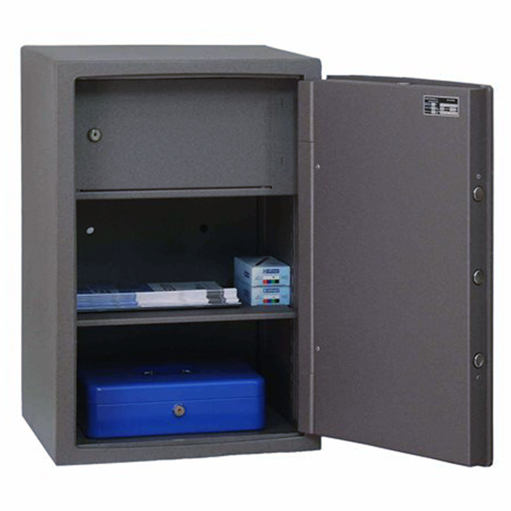 • minőségi páncélszekrény otthonába, irodájába• 20 mm vastag duplafalú acél test• 50 mm vastag duplafalú ajtó, 10 mm-es acél borítással• 110 fokos ajtónyitás erős jobboldali zsanérokkal• háromirányú záródás 22 mm-es forgó acél hevederekkel• mangán acéllappal védett zárszerkezet (fúrás ellen)• 8 lamellás duplatollú biztonsági zár, kettő darab kulccsal• praktikus iratrendező mélység (NTR 24-től)• kivehető, állítható magasságú polc• 61-es mérettől zárható belső trezorral• 10 mm-es rögzítő furatok lefelé és hátrafelé• exkluzív gránit színben szállítjuk