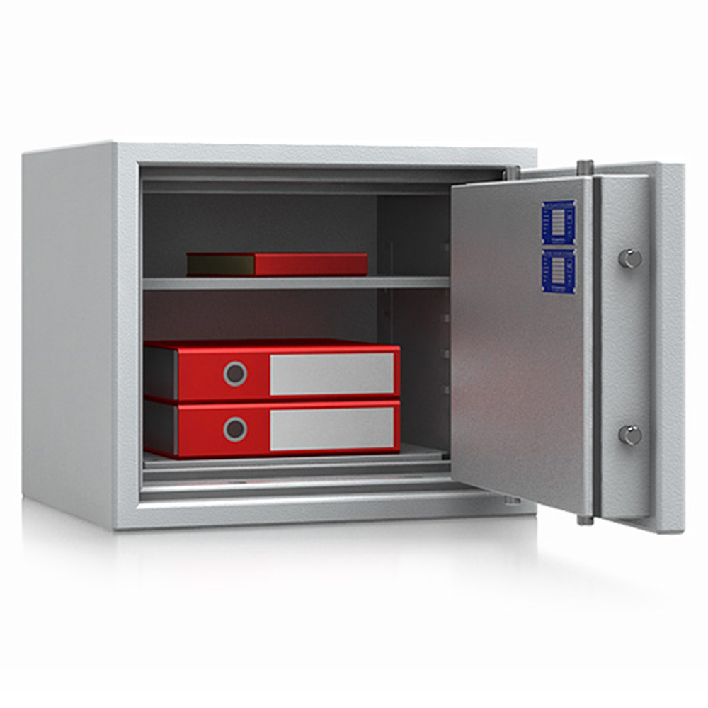 • 60 perces tűzállóság dokumentumok részére• 1090C-on a belső hőmérséklet 150C alatt marad• többrétegű acél test, speciális hőszigetelő töltettel• 114 mm vastag, többrétegű acél ajtó, speciális töltettel• speciális füst,- és vízszigetelő tömítés az ajtóban• 180 fokos ajtónyitás a külső zsanéroknak köszönhetően• háromirányú zárás, 25 mm-es kerek, acél hevederekkel• erős rögzítő fülek a zsanéroldalon• felfúrás ellen mangán acéllappal védett zárszerkezet• állítható magasságú polcok• rögzítő furat lefelé• világosszürke (RAL 7035) szín