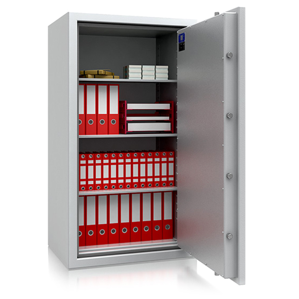 • MSZ EN 1143-1 szerinti EU 0 ellenállási fokozat• 30 perces tűzállóság dokumentumok részére• 840C-on a belső hőmérséklet 150C alatt marad• többrétegű acél test, speciális hőszigetelő töltettel• 105 mm vastag, többrétegű acél ajtó, speciális töltettel• 180 fokos ajtónyitás a külső zsanéroknak köszönhetően• háromirányú zárás, 25 mm-es kerek, acél hevederekkel• erős rögzítő fülek a zsanéroldalon• felfúrás ellen mangán acéllappal védett zárszerkezet• Dortmund 12, 13 és 18 duplaszárnyú ajtóval készül• állítható magasságú polcok• rögzítő furat lefelé• világosszürke (RAL 7035) szín