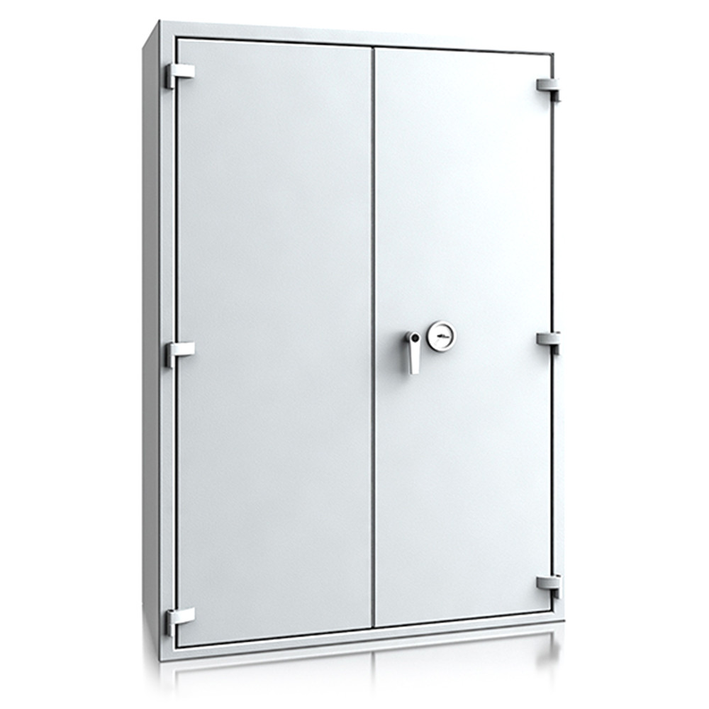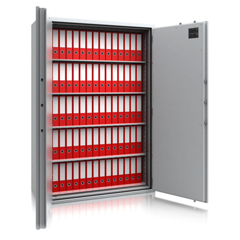 • 30 perces tűzállóság dokumentumok részére• 840C-on a belső hőmérséklet 150C alatt marad• duplafalú acél test, speciális hőszigetelő töltettel• 78 mm vastag, duplafalú acél ajtó, speciális töltettel• speciális füst,- és vízszigetelő tömítés az ajtóban• 180 fokos ajtónyitás a külső zsanéroknak köszönhetően• háromirányú zárás, 25 mm-es kerek, acél hevederekkel• erős rögzítő fülek a zsanéroldalon• felfúrás ellen mangán acéllappal védett zárszerkezet• Vaihingen 9 és 10 duplaszárnyú ajtóval készül• állítható magasságú polcok• rögzítő furat lefelé• világosszürke (RAL 7035) szín