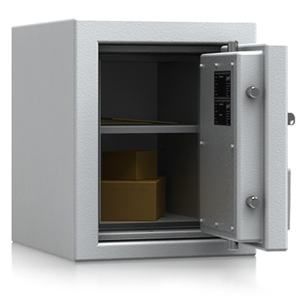 • 30 perces tűzállóság dokumentumok részére• 840C-on a belső hőmérséklet 150C alatt marad• duplafalú acél test, speciális hőszigetelő töltettel• 78 mm vastag, duplafalú acél ajtó, speciális töltettel• speciális füst,- és vízszigetelő tömítés az ajtóban• 180 fokos ajtónyitás a külső zsanéroknak köszönhetően• háromirányú zárás, 25 mm-es kerek, acél hevederekkel• erős rögzítő fülek a zsanéroldalon• felfúrás ellen mangán acéllappal védett zárszerkezet• Mettmann 9 és 10 duplaszárnyú ajtóval készül• állítható magasságú polcok• rögzítő furat lefelé• világosszürke (RAL 7035) szín