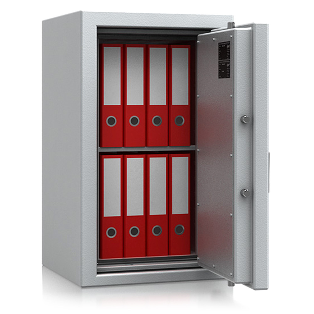 • 30 perces tűzállóság dokumentumok részére• 840C-on a belső hőmérséklet 150C alatt marad• duplafalú acél test, speciális hőszigetelő töltettel• 78 mm vastag, duplafalú acél ajtó, speciális töltettel• speciális füst,- és vízszigetelő tömítés az ajtóban• 180 fokos ajtónyitás a külső zsanéroknak köszönhetően• háromirányú zárás, 25 mm-es kerek, acél hevederekkel• erős rögzítő fülek a zsanéroldalon• felfúrás ellen mangán acéllappal védett zárszerkezet• Mettmann 9 és 10 duplaszárnyú ajtóval készül• állítható magasságú polcok• rögzítő furat lefelé• világosszürke (RAL 7035) szín