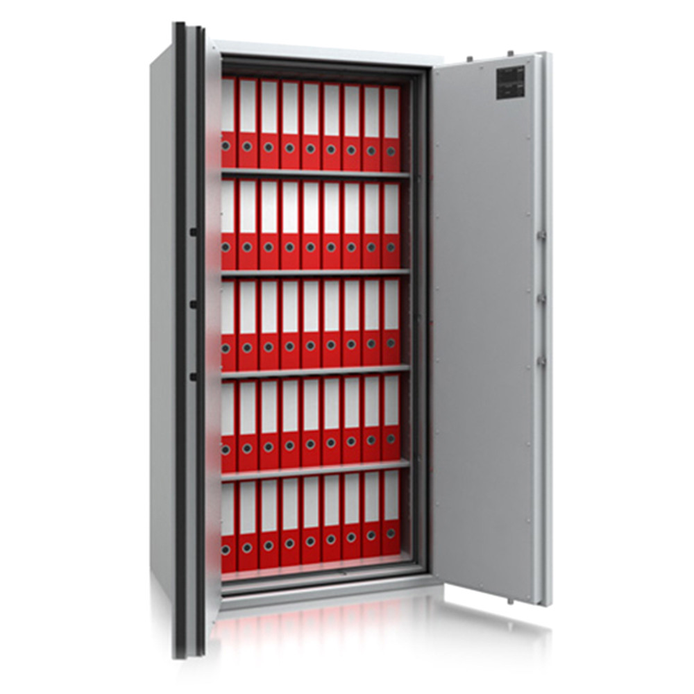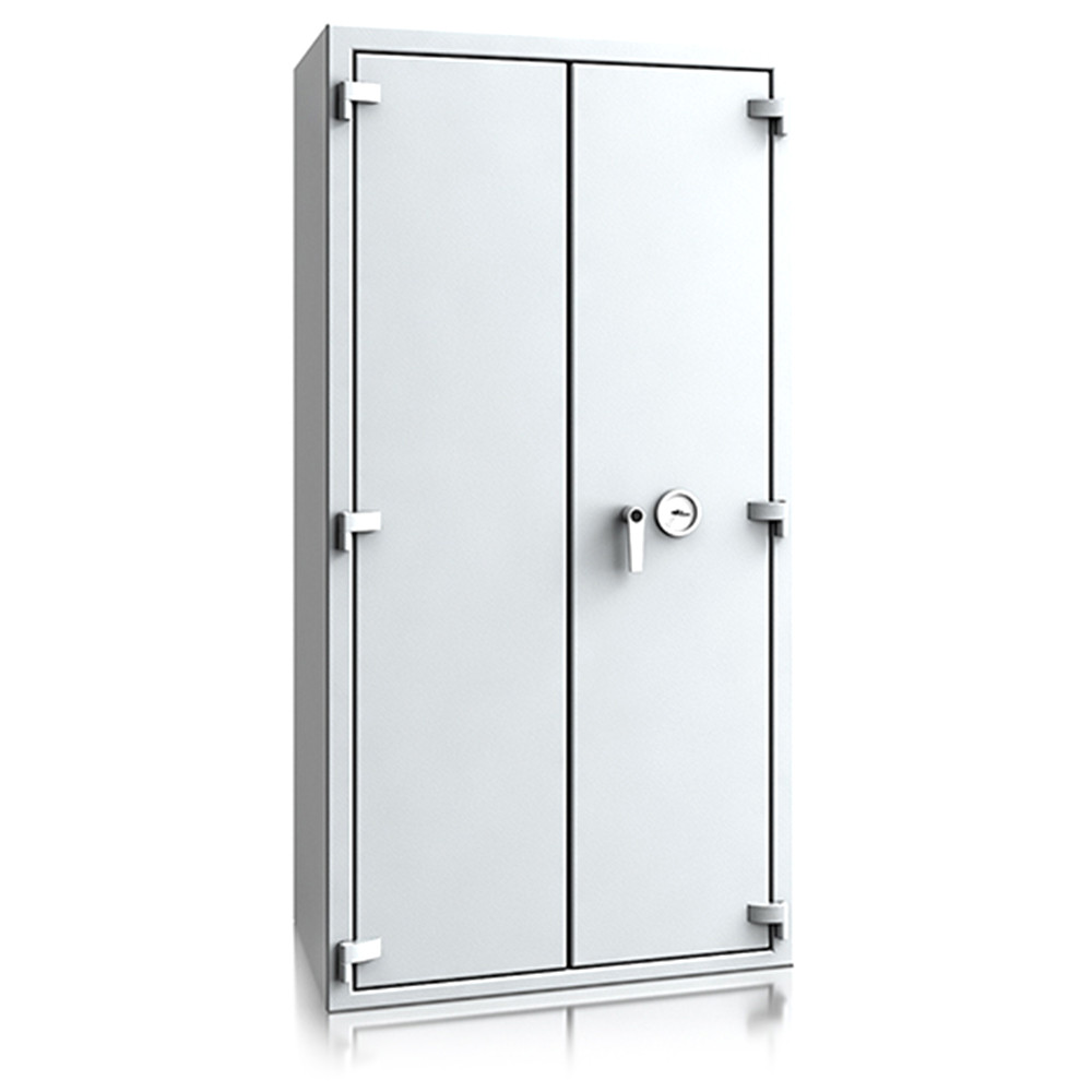• 30 perces tűzállóság dokumentumok részére• 840C-on a belső hőmérséklet 150C alatt marad• duplafalú acél test, speciális hőszigetelő töltettel• 78 mm vastag, duplafalú acél ajtó, speciális töltettel• speciális füst,- és vízszigetelő tömítés az ajtóban• 180 fokos ajtónyitás a külső zsanéroknak köszönhetően• háromirányú zárás, 25 mm-es kerek, acél hevederekkel• erős rögzítő fülek a zsanéroldalon• felfúrás ellen mangán acéllappal védett zárszerkezet• Mettmann 9 és 10 duplaszárnyú ajtóval készül• állítható magasságú polcok• rögzítő furat lefelé• világosszürke (RAL 7035) szín