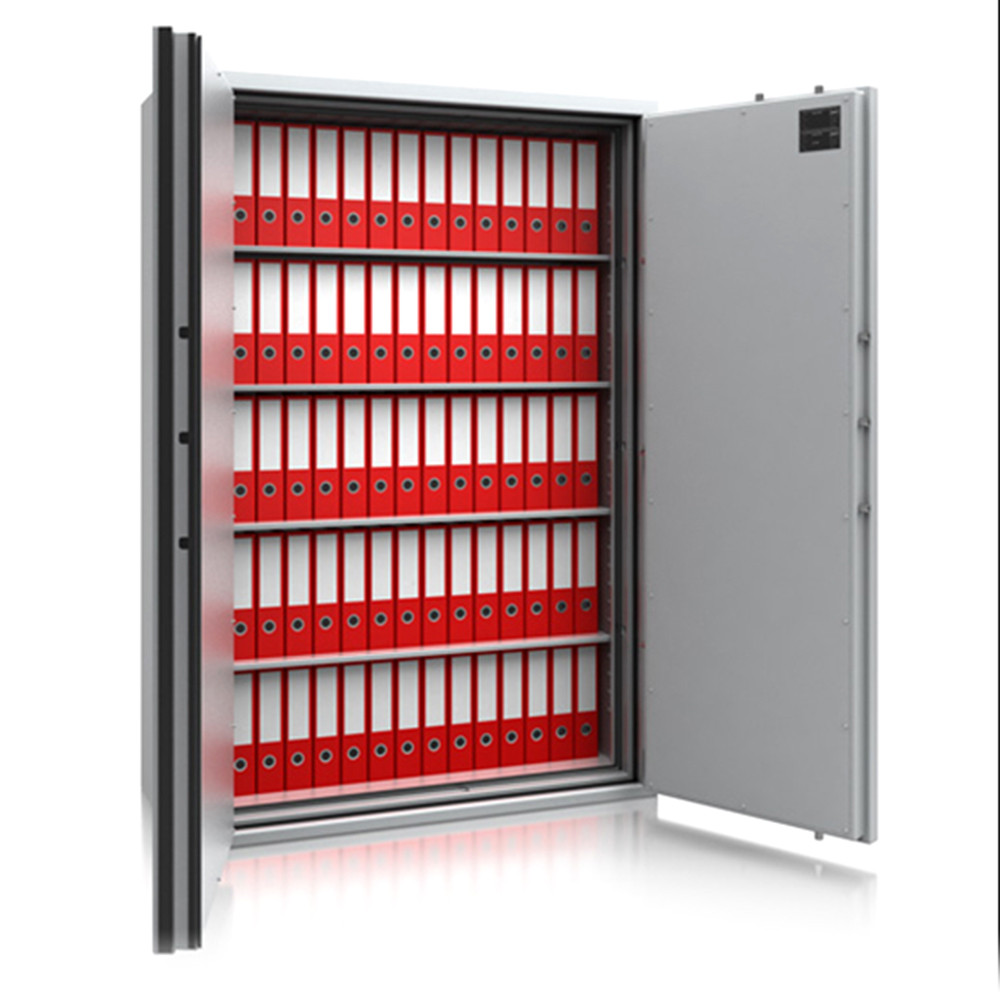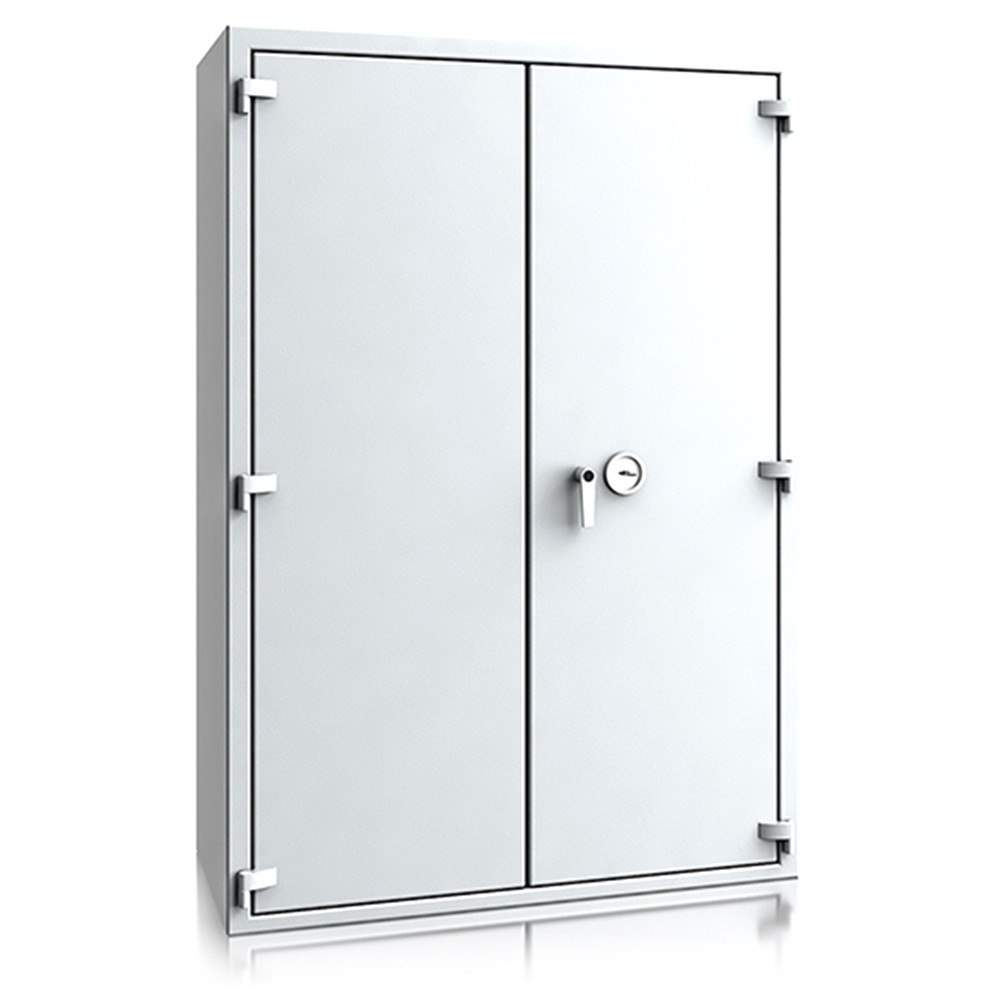 • 30 perces tűzállóság dokumentumok részére• 840C-on a belső hőmérséklet 150C alatt marad• duplafalú acél test, speciális hőszigetelő töltettel• 78 mm vastag, duplafalú acél ajtó, speciális töltettel• speciális füst,- és vízszigetelő tömítés az ajtóban• 180 fokos ajtónyitás a külső zsanéroknak köszönhetően• háromirányú zárás, 25 mm-es kerek, acél hevederekkel• erős rögzítő fülek a zsanéroldalon• felfúrás ellen mangán acéllappal védett zárszerkezet• Mettmann 9 és 10 duplaszárnyú ajtóval készül• állítható magasságú polcok• rögzítő furat lefelé• világosszürke (RAL 7035) szín