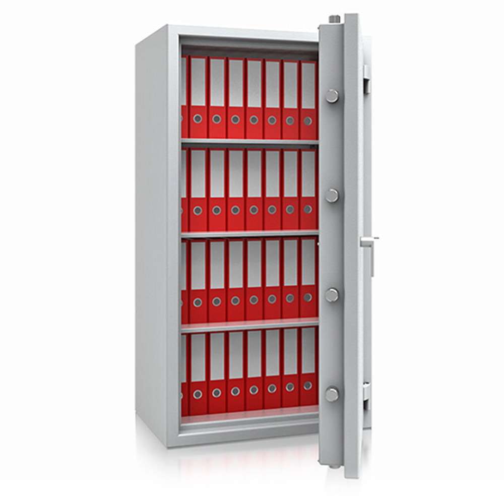 • 30 perces tűzállóság dokumentumok részére• 840C-on a belső hőmérséklet 150C alatt marad• többrétegű acél test, speciális hőszigetelő beton töltettel• 109 mm vastag, többrétegű acél ajtó, speciális töltettel• 180 fokos ajtónyitás a külső zsanéroknak köszönhetően• háromirányú zárás, 25 mm-es kerek, acél hevederekkel• erős rögzítő fülek a zsanéroldalon• felfúrás ellen mangán acéllappal védett zárszerkezet• mechanikus és termikus hatásra aktiválódó passzív zár• Paris 13, 14, 15 és 20 duplaszárnyú ajtóval készül• állítható magasságú polcok• rögzítő furat lefelé• világosszürke (RAL 7035) szín