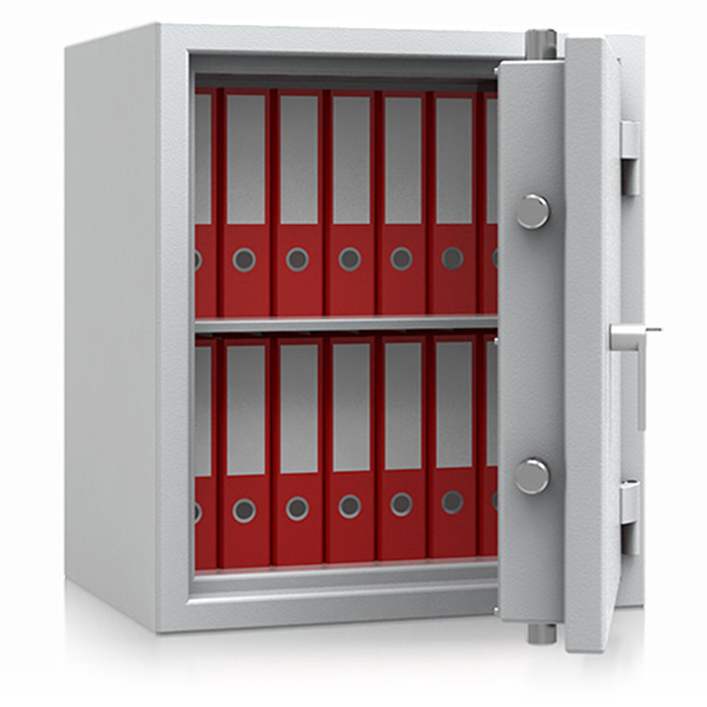 • 30 perces tűzállóság dokumentumok részére• 840C-on a belső hőmérséklet 150C alatt marad• többrétegű acél test, speciális hőszigetelő beton töltettel• 109 mm vastag, többrétegű acél ajtó, speciális töltettel• 180 fokos ajtónyitás a külső zsanéroknak köszönhetően• háromirányú zárás, 25 mm-es kerek, acél hevederekkel• erős rögzítő fülek a zsanéroldalon• felfúrás ellen mangán acéllappal védett zárszerkezet• mechanikus és termikus hatásra aktiválódó passzív zár• Paris 13, 14, 15 és 20 duplaszárnyú ajtóval készül• állítható magasságú polcok• rögzítő furat lefelé• világosszürke (RAL 7035) szín