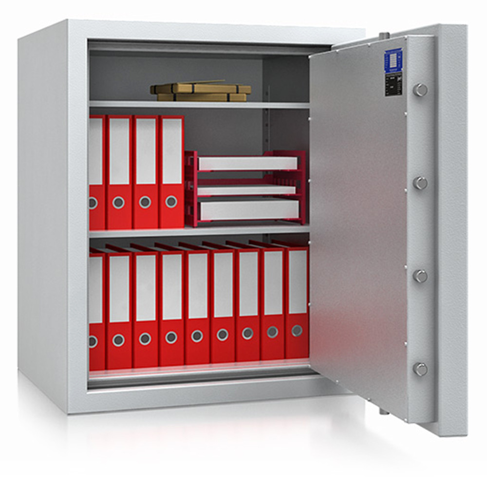 • 30 perces tűzállóság dokumentumok részére• 840C-on a belső hőmérséklet 150C alatt marad• többrétegű acél test, speciális hőszigetelő beton töltettel• 130 mm vastag, többrétegű acél ajtó, speciális töltettel• 180 fokos ajtónyitás a külső zsanéroknak köszönhetően• háromirányú zárás, 25 mm-es kerek, acél hevederekkel• erős rögzítő fülek a zsanéroldalon• felfúrás ellen mangán acéllappal védett zárszerkezet• mechanikus és termikus hatásra aktiválódó passzív zár• Rom 12, 13, 14 és 19 duplaszárnyú ajtóval készül• állítható magasságú polcok• rögzítő furat lefelé• világosszürke (RAL 7035) szín