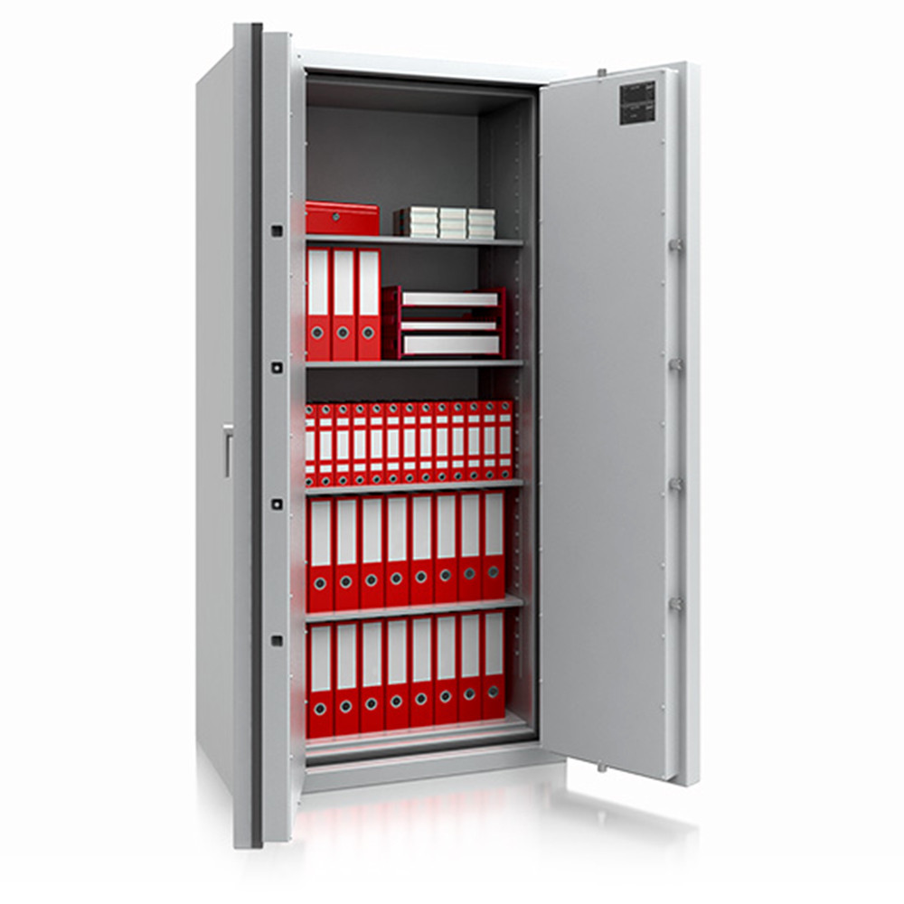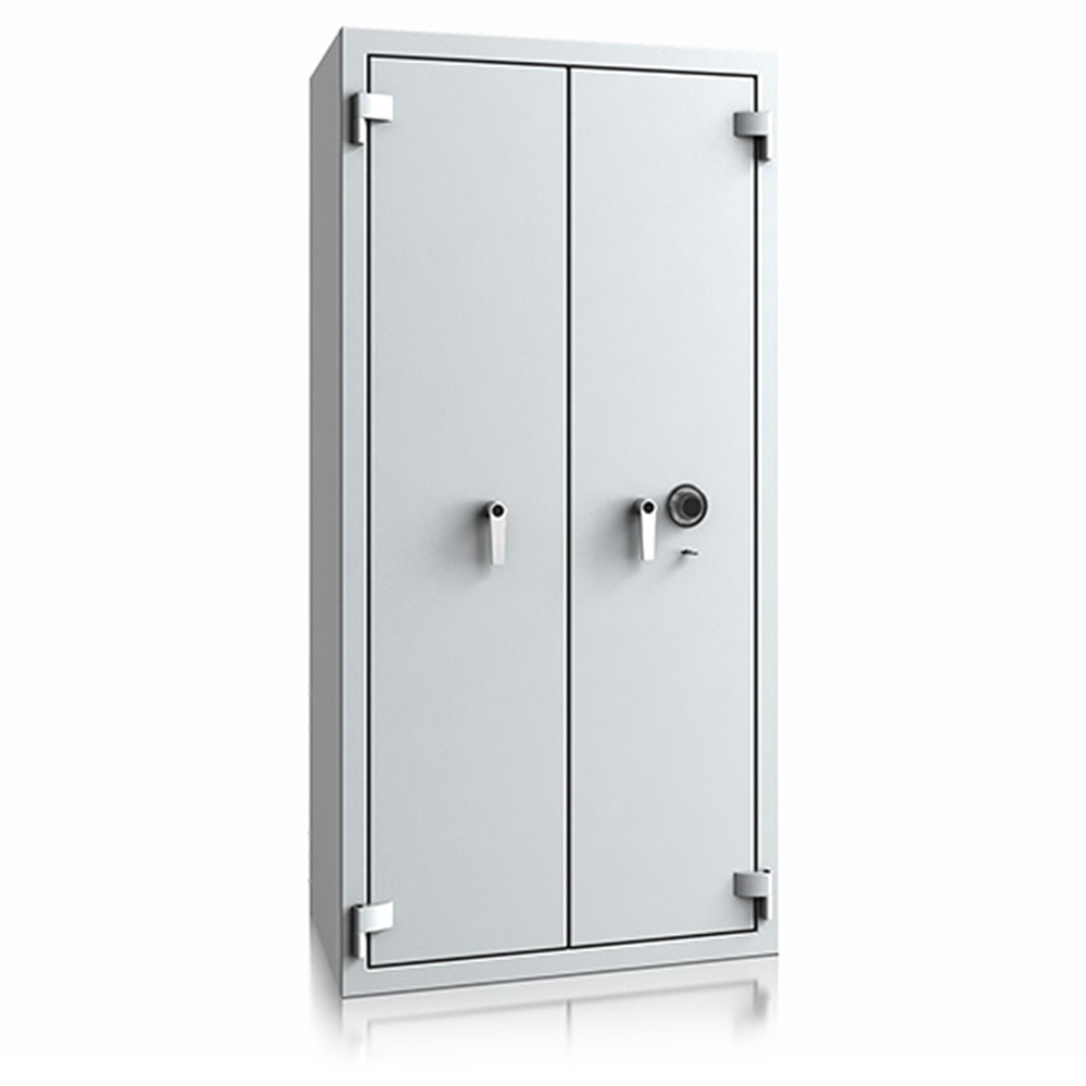 • 30 perces tűzállóság dokumentumok részére• 840C-on a belső hőmérséklet 150C alatt marad• többrétegű acél test, speciális hőszigetelő beton töltettel• 130 mm vastag, többrétegű acél ajtó, speciális töltettel• 180 fokos ajtónyitás a külső zsanéroknak köszönhetően• háromirányú zárás, 25 mm-es kerek, acél hevederekkel• erős rögzítő fülek a zsanéroldalon• felfúrás ellen mangán acéllappal védett zárszerkezet• mechanikus és termikus hatásra aktiválódó passzív zár• London 12, 13, 14 és 19 duplaszárnyú ajtóval készül• állítható magasságú polcok• riasztó előkészítés• rögzítő furat lefelé• világosszürke (RAL 7035) szín